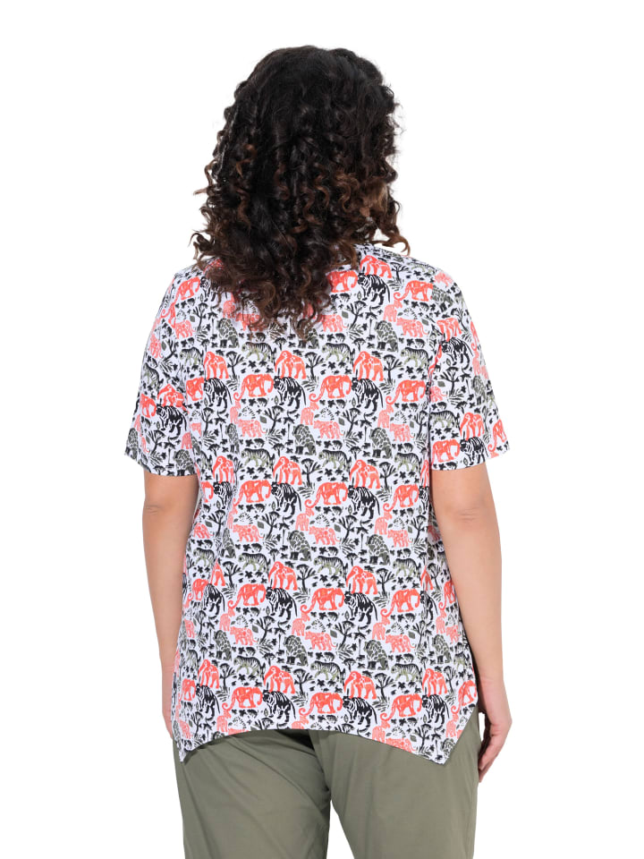 Широкая футболка А-силуэта из мягкого трикотажа с нежным анималистичным рисунком. V-образный вырез с декоративными складками, короткие рукава и заостренный подол.