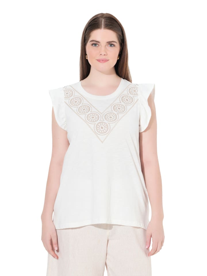 Футболка из органического хлопка с вышитой каймой на круглом вырезе. Классический крой из мягкого трикотажа с воланами на рукавах. Боковые разрезы для плавного падения. Органический; сертифицирован ECOCERT Greenlife Лицензия №. 152026.