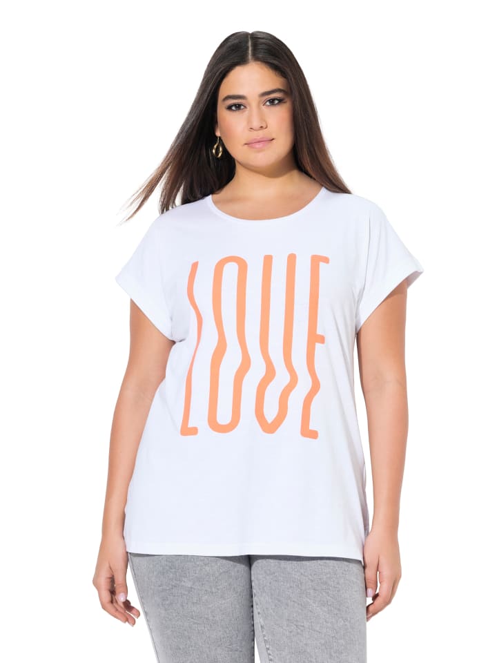 Футболка оверсайз из мягкого трикотажа с тонкой структурой и надписью LOVE. Круглый вырез, спущенная линия плеча, короткие рукава с отворотами.