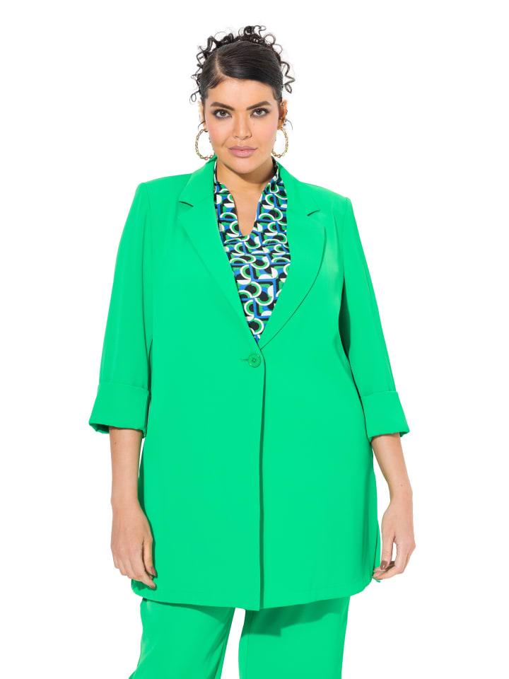 Пиджак удлиненный, свободного кроя, из гладкой ткани. Воротник с лацканами, застежка на пуговицы, рукава 3/4 с отворотами. Современная изюминка: боковые разрезы для удобной посадки и полной свободы движений.