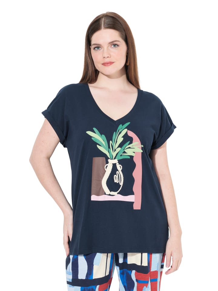 Футболка свободного кроя из органического хлопка с рисунком в виде средиземноморской вазы. Округлый V-образный вырез, спущенная линия плеча, короткие рукава с отворотом. Подол закругленный и удлиненный сзади. Органический; сертифицирован ECOCERT Greenlife Лицензия №. 152026.