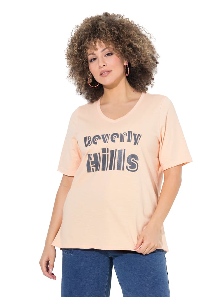 Футболка классического кроя из мягкого трикотажа с блестящей надписью Beverly Hills. V-образный вырез, короткие рукава.