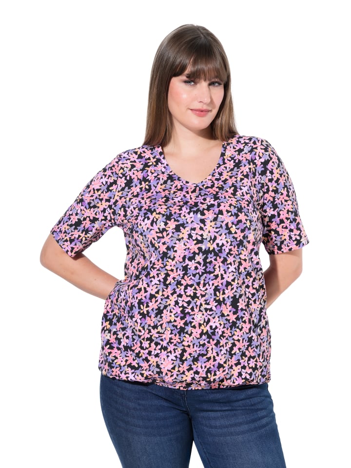 Футболка удобного кроя с принтом по всей поверхности и эластичным поясом — всегда комфортно. V-образный вырез, короткие рукава.