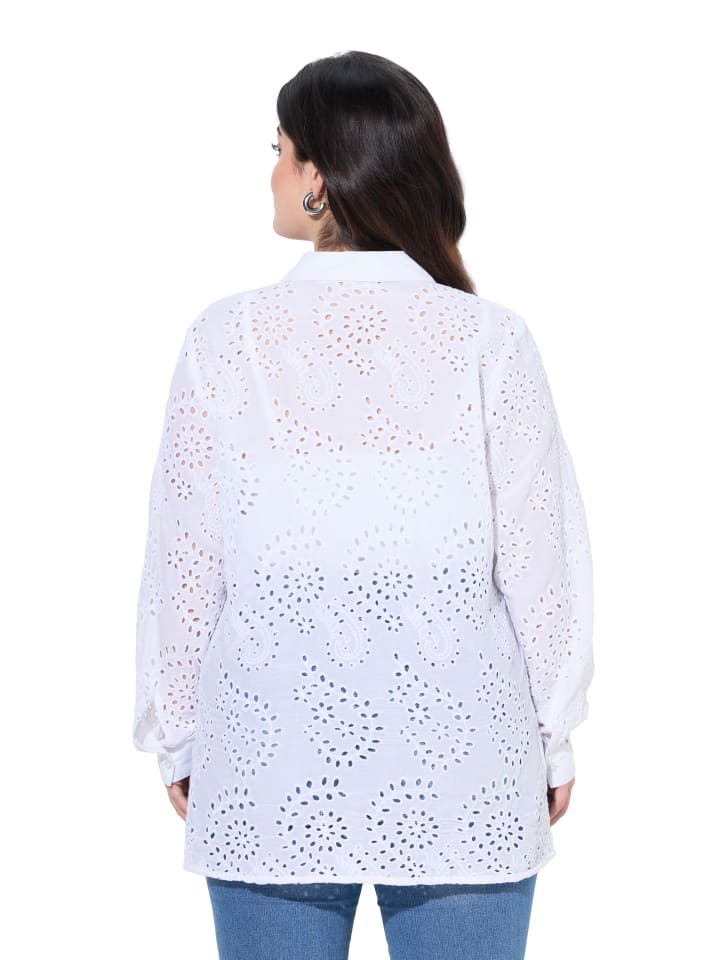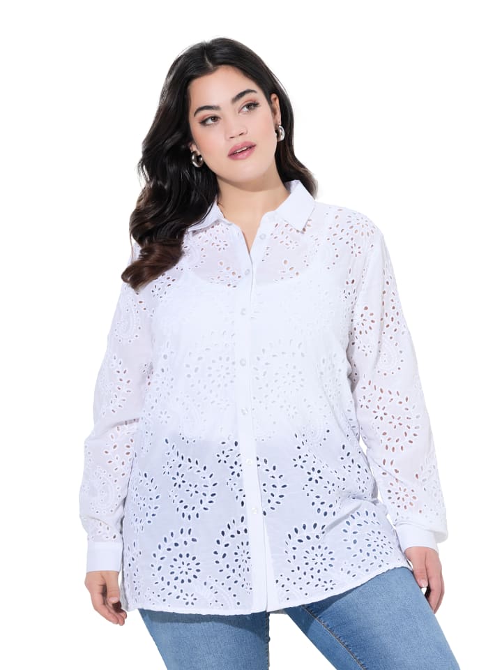 Блузка А-силуэта из мягкого хлопка с ажурной вышивкой. Воротник рубашки, застежка на пуговицы, длинные рукава с манжетами. Боковые разрезы.