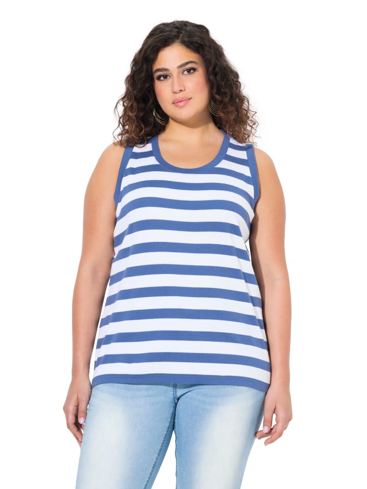 Полосатый топ, без рукавов, классический крой, выполнен из мягкого трикотажа в рубчик (естественно эластичного), с круглым вырезом.
