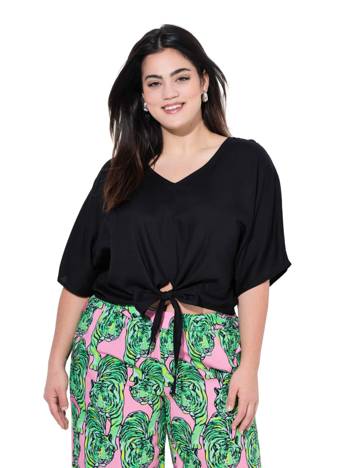 Блузка-рубашка, удобного кроя, из мягкой вискозы с декоративным узлом по подолу. V-образный вырез, спущенная линия плеча, короткие рукава.