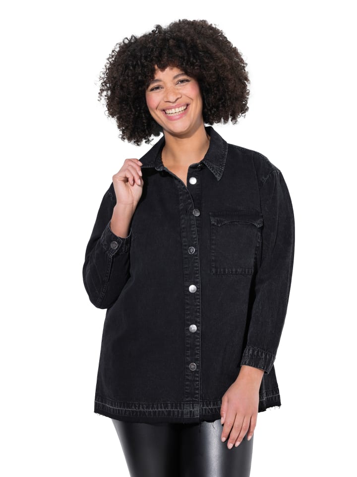 Джинсовая блузка-рубашка А-силуэта из мягкого денима холодного крашения с бахромой по низу. Воротник рубашки, спущенные плечи, нагрудный карман, длинные рукава с манжетами.