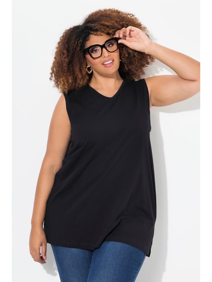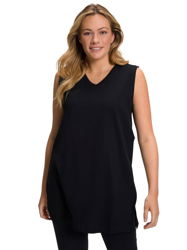 Базовая майка высокого качества. V-образный вырез, без рукавов, широкие бретели. Боковые разрезы по подолу. Прямой крой - свободная посадка. Длина с учетом размера: прибл. 78-87 см. Модный базовый топ из мягкого хлопка приятного свободного кроя. Однотонный топ имеет V-образный вырез и разрезы по бокам. Его можно комбинировать по-разному, и он обязательно должен быть в каждом шкафу! Конечно, его можно стирать и в машинке.