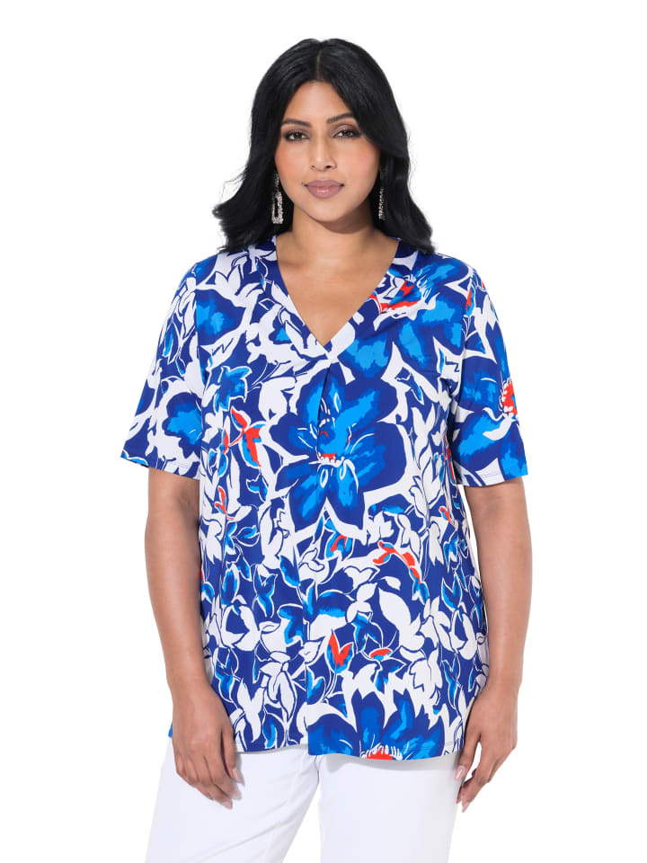 Облегающая рубашка классического кроя из обтягивающего трикотажа с цветочным рисунком. V-образный вырез с высококачественной обработкой панелей. Рукава половинной длины, разрезы по бокам.