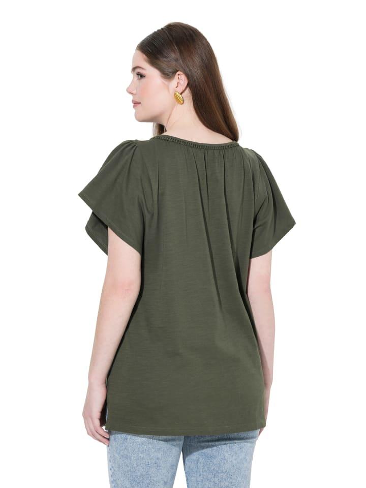 Футболка из мягкого трикотажа с тонкой структурой. Декоративная тесьма от выреза туники с завязкой на подоле. Рукав-крылышко с оборкой на плече. Боковые разрезы для удобной посадки.