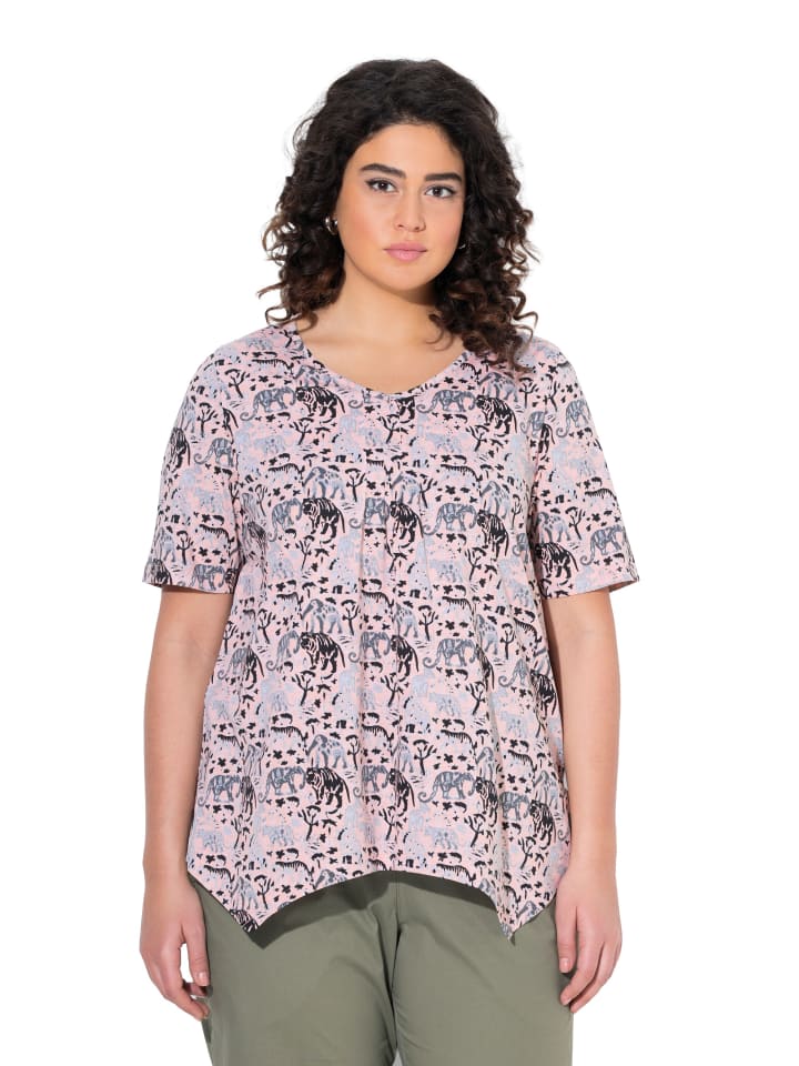 Широкая футболка А-силуэта из мягкого трикотажа с нежным анималистичным рисунком. V-образный вырез с декоративными складками, короткие рукава и заостренный подол.