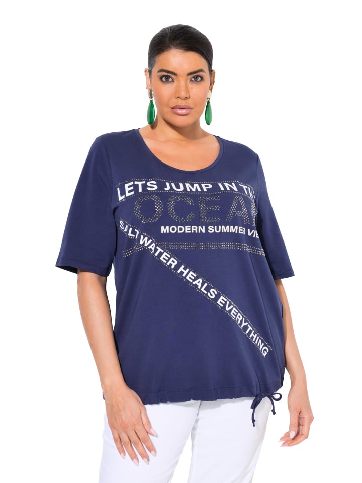 Футболка прямого кроя с надписью и блестящими заклепками. Круглый вырез, короткие рукава. Завязка по подолу — всегда желаемый силуэт.
