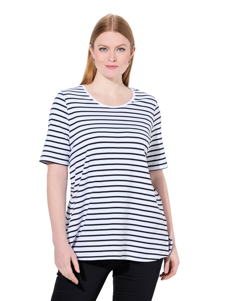 Полосатая рубашка А-силуэта из высококачественного мягкого хлопка. Круглый вырез, короткие рукава, разрезы по бокам — еще удобнее.