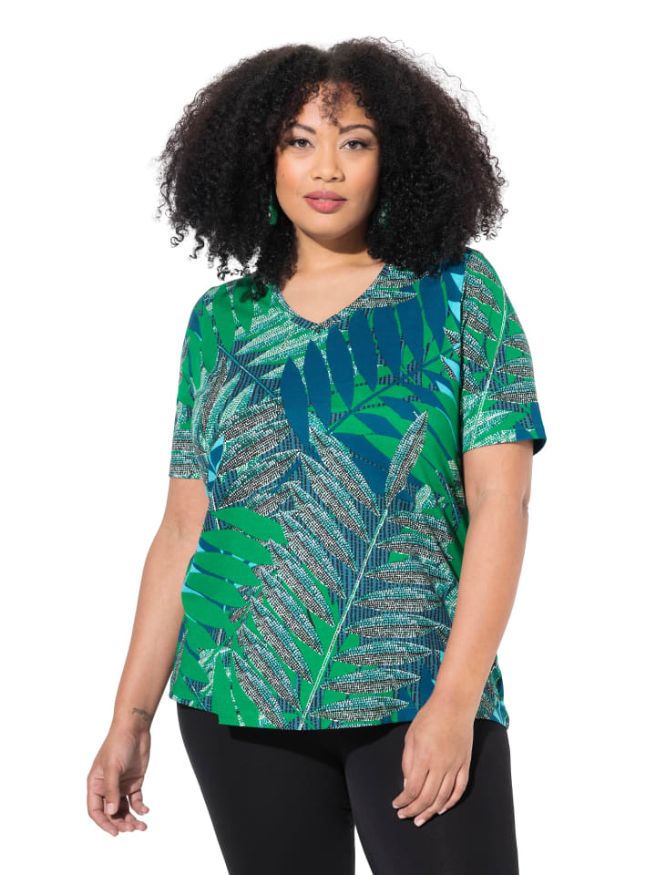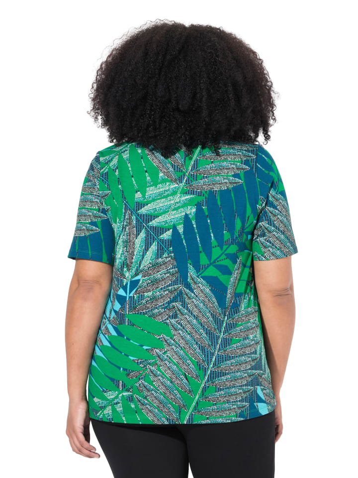 Футболка А-силуэта с принтом пальм. V-образный вырез, короткие рукава. Удобная ширина подола.