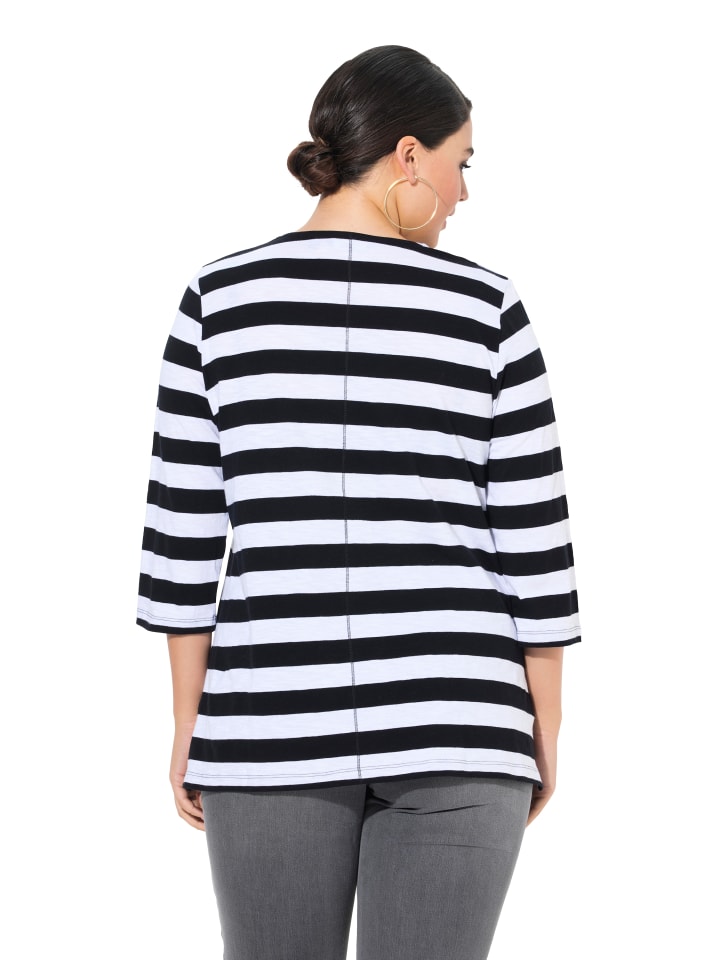 Классическая полосатая рубашка из мягкого трикотажа с декоративным рисунком пепперони. Округлый V-образный вырез, рукава 3/4.