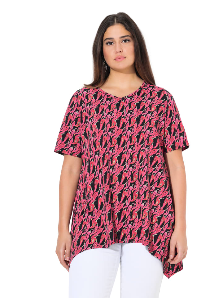 Футболка А-силуэта из мягкого трикотажа с принтом по всей поверхности и заостренным подолом. Округлый V-образный вырез, короткие рукава.