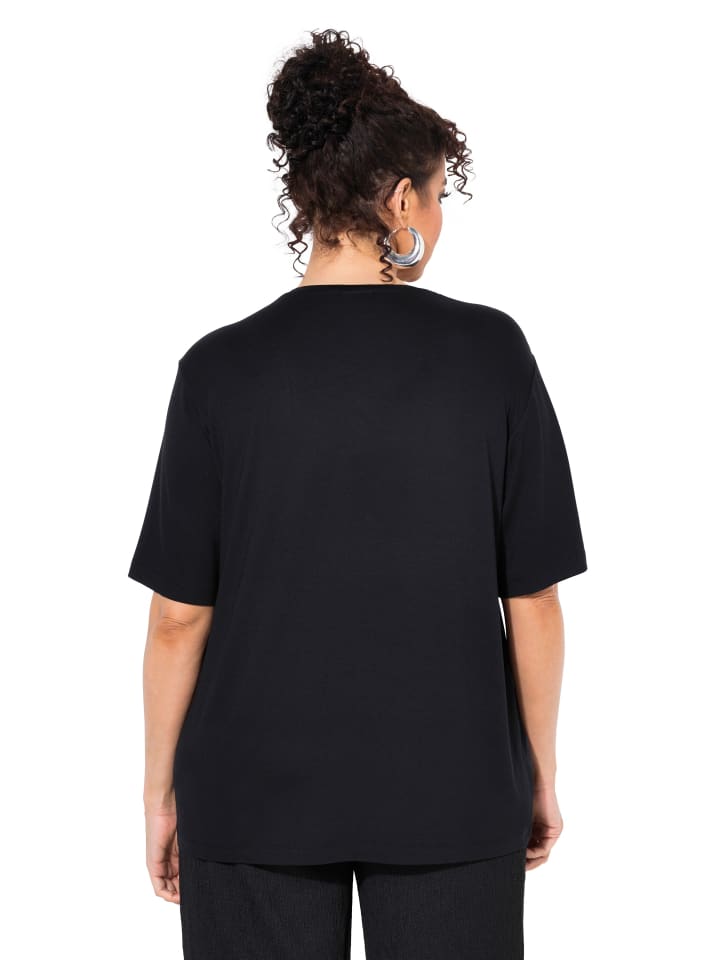Рубашка классического кроя. Передняя часть из мерцающего атласа со стразами на графическом принте и круглой горловине. Спинка и половина рукавов выполнены из трикотажа (95% вискозы, 5% эластана).