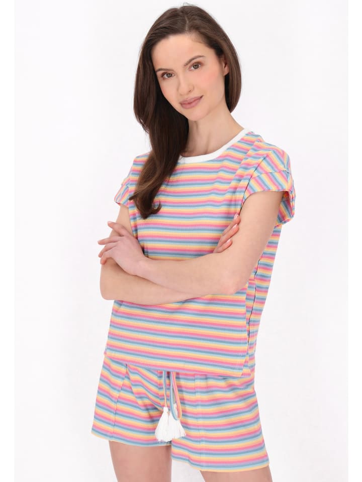 Расслабьтесь в этой футболке из коллекции Fashion Look. Футболка свободного кроя с круглым вырезом, рукавами-крылышками и полосатым узором для повседневного, удобного стиля. Идеально подходит для повседневной носки, эта трикотажная модель излучает непринужденное очарование благодаря контрастной отделке и закатанным рукавам. Идеально подходит для тех, кто ищет стильный образ.