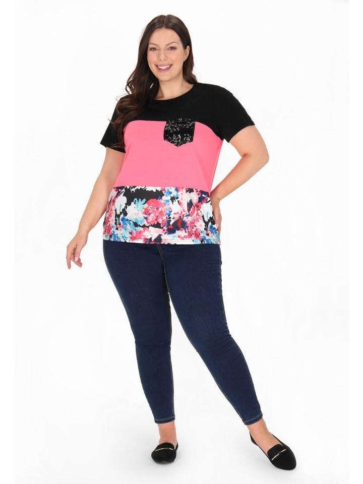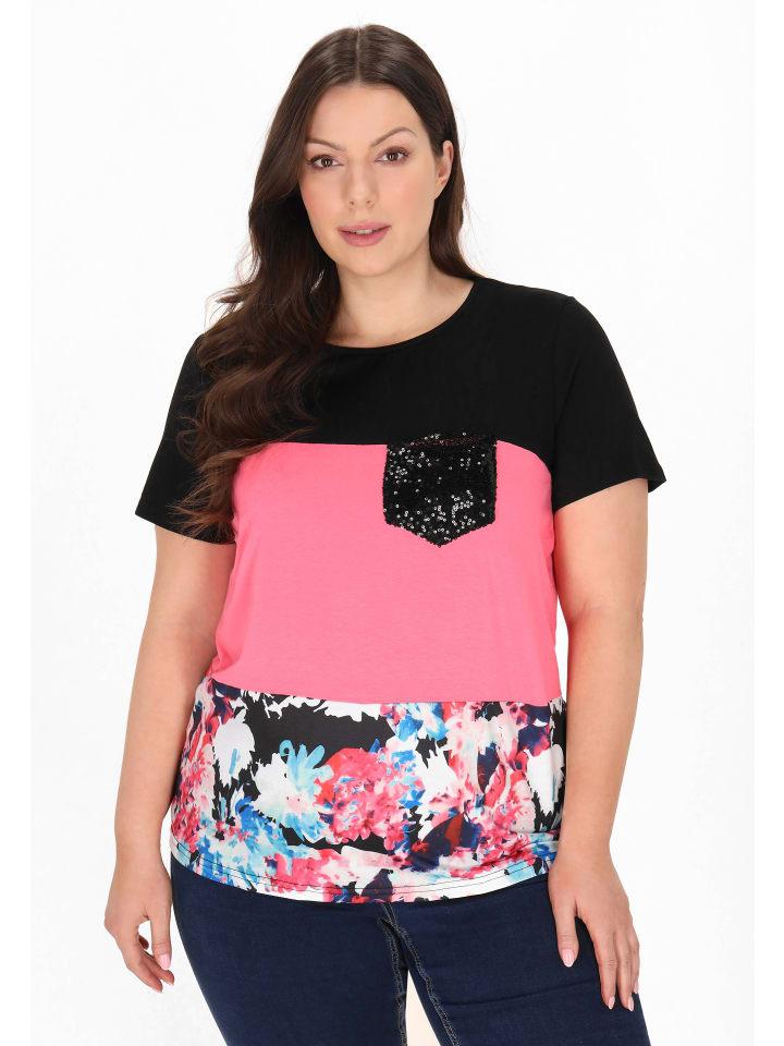 Подчеркните свой повседневный стиль с помощью этой шикарной футболки из нашей коллекции больших размеров. Модель с круглым вырезом и короткими рукавами имеет удобную посадку, которая подходит любому типу фигуры. Нагрудный карман с пайетками добавляет стильный штрих, а цветные блоки подчеркивают трикотаж, что делает изделие идеальным для повседневных выходов. Эта футболка является частью нашей коллекции Plus Size.