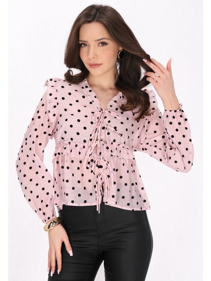 Откройте для себя очарование этой элегантной блузки с непринужденным кроем и глубоким V-образным вырезом, который льстит любой фигуре. Длинные рукава собираются на эластичных манжетах, создавая стильный силуэт. Оборки и завязка спереди дополняют тканый материал игривым принтом в горошек, что делает его идеальным выбором для любителей моды, ищущих модные блузки из коллекции Fashion Look.