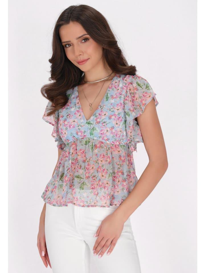 Почувствуйте элегантность с этой стильной женской блузкой с V-образным вырезом и нежными короткими рукавами-крылышками. Прямой лиф переходит в многослойный силуэт, излучая романтическое очарование. Изготовленная из тканого материала и украшенная красивым цветочным принтом, эта модель идеально подходит для повседневной носки и неформальных мероприятий. Часть коллекции Fashion Look.