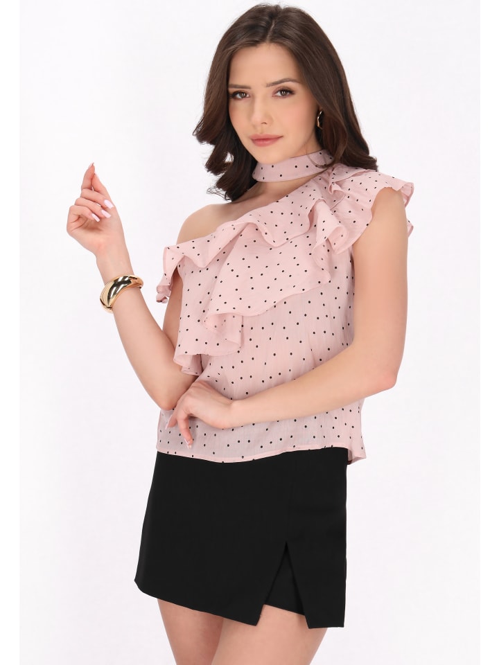 Дополните свой гардероб этой элегантной блузкой с шикарным гофрированным узором, который ниспадает с одного плеча. Вырез-чокер демонстрирует оборки и излучает шик, а свободный крой обеспечивает свободу движений. Она имеет нежный женственный узор в горошек, идеально подходящий для стильного образа. Она является частью коллекции Fashion Look.