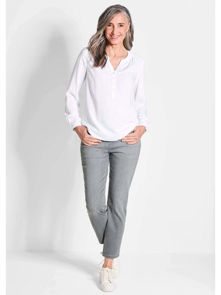 Блузка из чистой вискозы — приятная на ощупь и обеспечивает максимальный комфорт при носке! Базовая модель обеспечивает удобную дополнительную ширину за счет складок на плечах и кокетки на спине. Сзади платье немного удлинено, а закругленный подол и разрезы по бокам создают непринужденный образ. Круглый вырез горловины с панелью переходит в растягивающийся V-образный вырез с небольшой планкой на пуговицах. Блузка с длинными рукавами и манжетами станет прекрасным дополнением к вашему образу в любое время года! Длина ок. Размер 73 см. 46, ок. 69 см в размере 23.