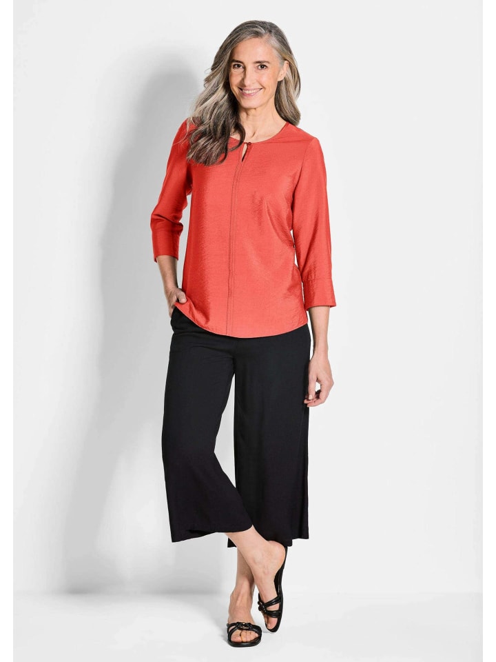 Блузка с круглым вырезом из слегка структурированной смеси вискозы для создания особого образа. Вырез горловины отделан небольшой пуговицей и разрезом, переходящим в декоративный шов. Рукава длиной 3/4 заканчиваются слегка более широкой манжетой и легко подворачиваются. Блузка немного удлинена сзади, что создает скрывающий эффект. С боковыми разрезами для оптимальной свободы движений. Длина ок. Размер 69 см. 46, ок. 65 см в размере 23.