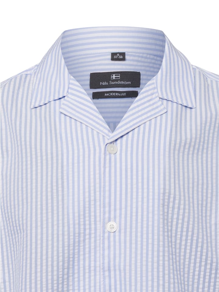Легкая, повседневная и стильная — хлопковая рубашка Нильса Сундстрема с воротником-лацканом и мелкой фактурной поверхностью воплощает летнюю элегантность в непринужденной манере. - Современный крой