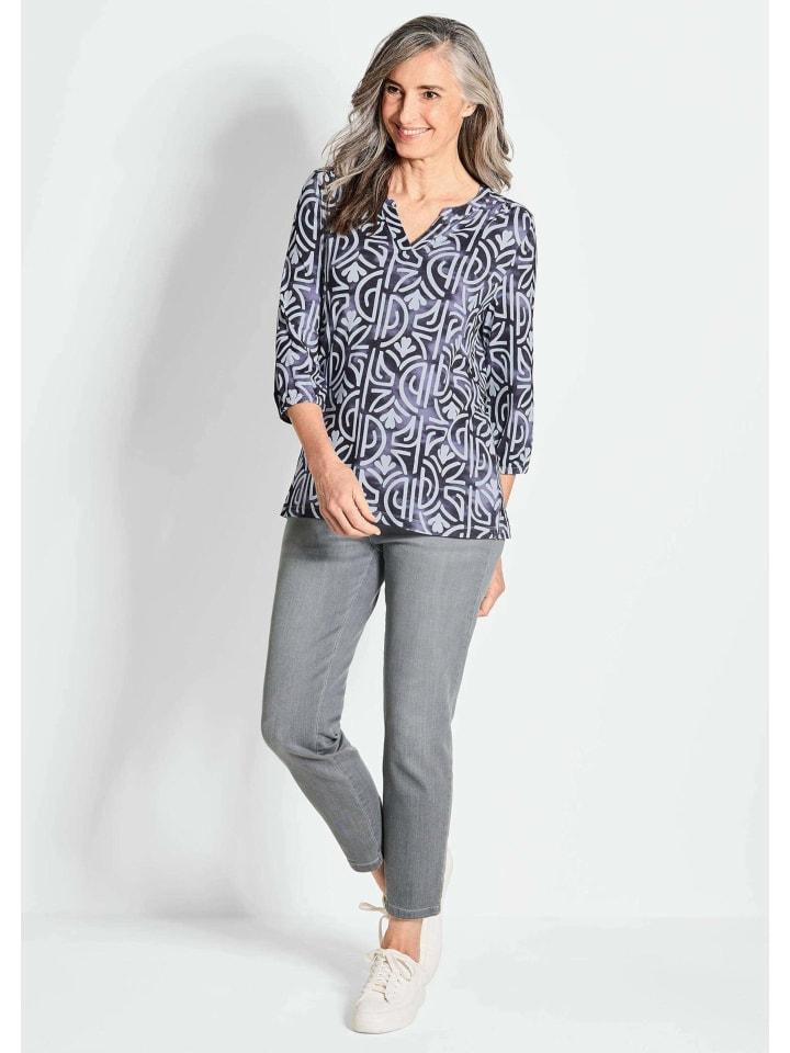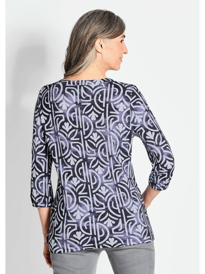 Трикотажная блузка с интересным принтом по всей поверхности, которая привнесет глоток свежего воздуха в ваш гардероб! Модель выполнена из эластичного, приятного на ощупь вискозного трикотажа и комфортно облегает фигуру. Передняя часть с кокеткой и оборками обеспечивает приятную дополнительную ширину. Круглый вырез с узкой вставкой, переходящей в растягивающийся V-образный вырез. Рукава длиной 3/4 с узкими эластичными манжетами легко закатываются. С разрезами по бокам. Длина ок. Размер 66 см. 46, ок. 62 см в размере 23.