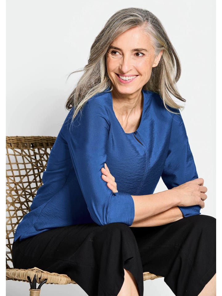 Блузка с круглым вырезом из слегка структурированной смеси вискозы для создания особого образа. Вырез горловины отделан небольшой пуговицей и разрезом, переходящим в декоративный шов. Рукава длиной 3/4 заканчиваются слегка более широкой манжетой и легко подворачиваются. Блузка немного удлинена сзади, что создает скрывающий эффект. С боковыми разрезами для оптимальной свободы движений. Длина ок. Размер 69 см. 46, ок. 65 см в размере 23.