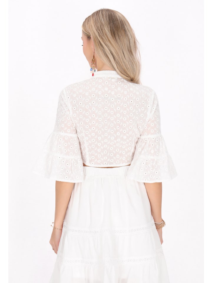 Представляем стильную блузку с фактурным узором в горошек, V-образным вырезом и бабочкой спереди. Расклешенные рукава три четверти добавляют женственности. Изготовленная из легкой ткани, она идеально подходит для теплых дней или для многослойного ношения. Веселая и стильная, эта блузка идеально подходит для лета или праздничных случаев. Эта блузка является частью коллекции Festival.