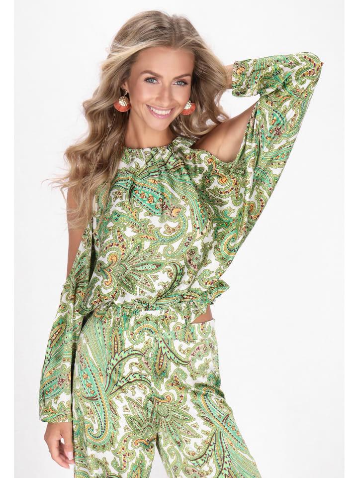 Обновите свой гардероб этой потрясающей блузкой свободного кроя со стильным круглым вырезом. Длинные рукава с вырезами дополнены эластичными манжетами, а ткань украшена принтом пейсли. Эта блузка идеально подойдет для повседневных и праздничных случаев и станет обязательным предметом вашего гардероба. Входит в коллекцию Весна-Лето.