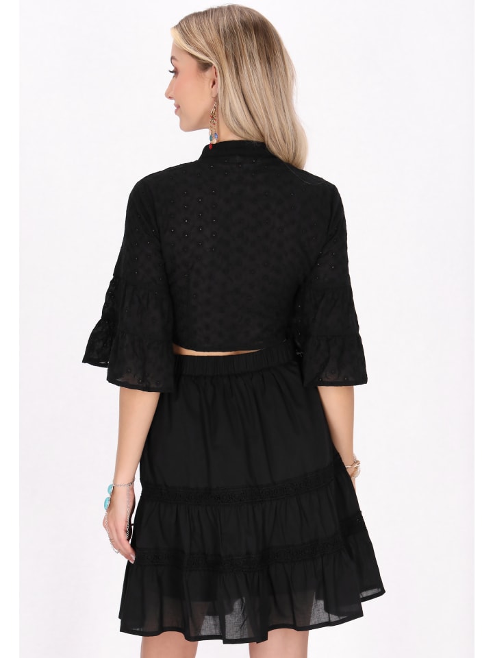 Представляем стильную блузку с фактурным узором в горошек, V-образным вырезом и бабочкой спереди. Расклешенные рукава три четверти добавляют женственности. Изготовленная из легкой ткани, она идеально подходит для теплых дней или для многослойного ношения. Веселая и стильная, эта блузка идеально подходит для лета или праздничных случаев. Эта блузка является частью коллекции Festival.