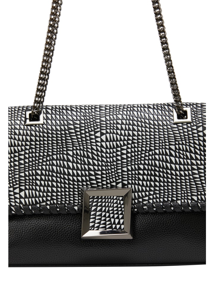 Поднимите свой стиль с помощью этой структурированной сумки-клапана, демонстрирующей яркий геометрический узор на клапане. Шикарный цепной ремешок обеспечивает универсальные варианты переноски, а внешний карман на молнии обеспечивает легкий доступ к необходимым вещам. Идеально подходит для любого элегантного случая, эта изысканная вещь сочетает в себе функциональность и изысканность в одном стильном аксессуаре.