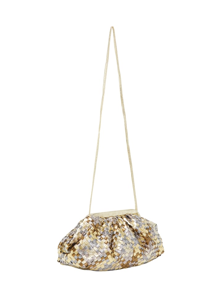 Откройте для себя этот стильный клатч с уникальным плетеным узором, который добавит очарования любому наряду. Благодаря округлому силуэту и собранному верху он предлагает причудливый штрих. Декоративная застежка усиливает его привлекательность, а съемный ремешок обеспечивает универсальность для ношения через плечо или на плече. Внутри внутренний карман на молнии обеспечивает надежное хранение ваших самых необходимых вещей, что делает его идеальным для вечерних мероприятий.