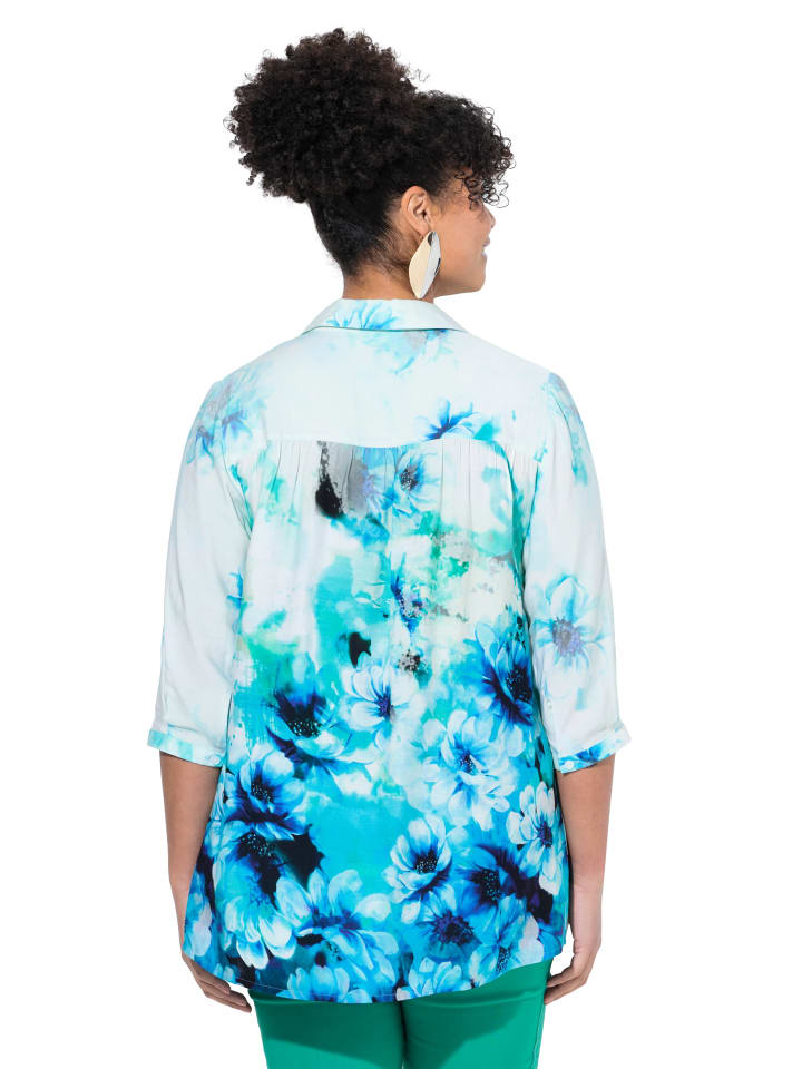 Длинная туника А-силуэта из мягкой вискозы с цветочным градиентным узором. Воротник рубашки с декоративной складкой под V-образным вырезом, рукава 3/4 с манжетами.