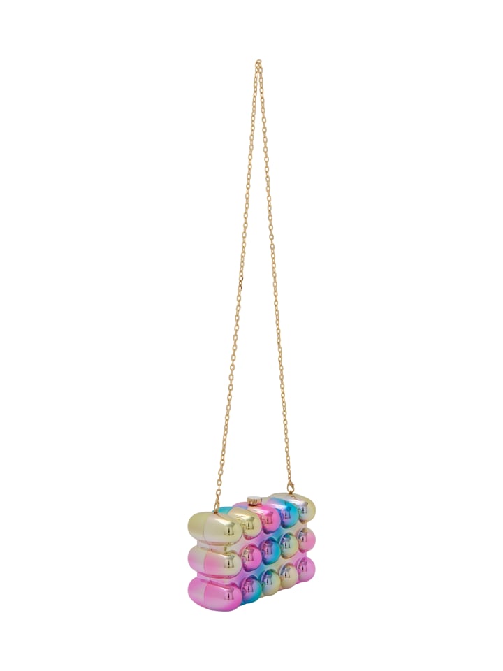 Откройте для себя этот стильный прямоугольный клатч, украшенный ярким геометрическим узором из округлых форм. Его гладкая, глянцевая отделка отражает свет, создавая современный образ. Дополненный декоративной застежкой и дополнительной цепочкой, он предлагает универсальность для любого случая вечеринки. Этот компактный дизайн безупречно сочетает в себе игривость и изысканность для модниц.
