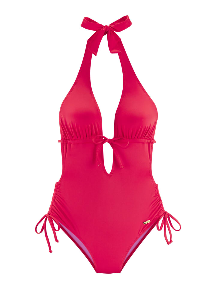Купальник от Buffalo модного однотонного цвета. Широкий воротник-халтер с завязками. Регулируемая резинка под грудью. С завязками по бокам. Женственный крой. Приятное качество.