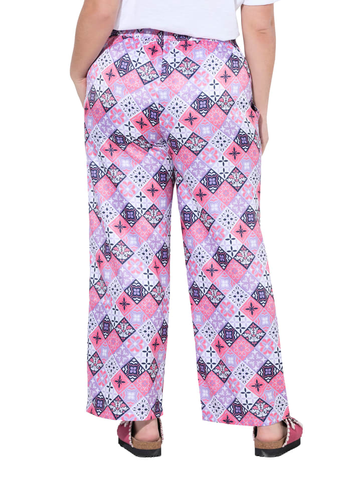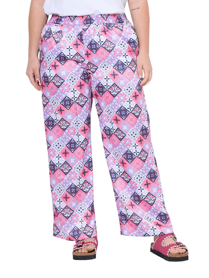 Широкие прямые брюки из мерцающего атласа с принтом по всей поверхности. Эластичный пояс с боковыми карманами.