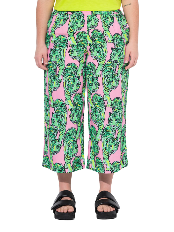 Широкие прямые брюки из мягкой вискозы с красочным леопардовым принтом. Эластичный пояс с боковыми карманами.