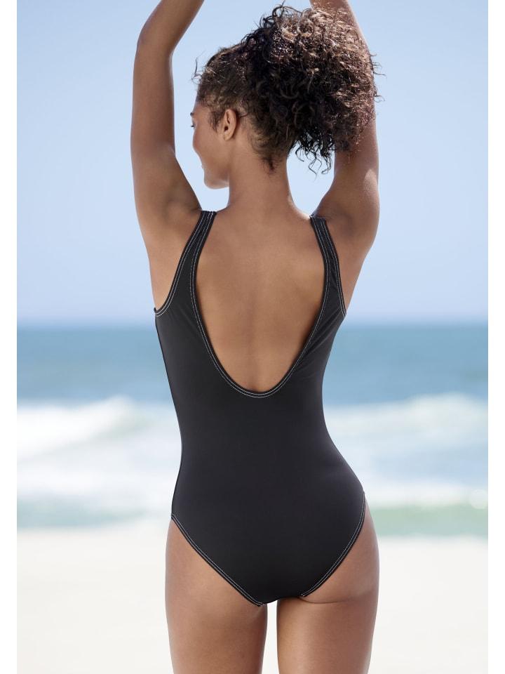 Купальник от Elbsand. Контрастные по цвету фирменные надписи. Контрастные швы. Съемные чашки. Круглый вырез на спине. Классический крой. Удобный материал с долей переработанного полиамида.