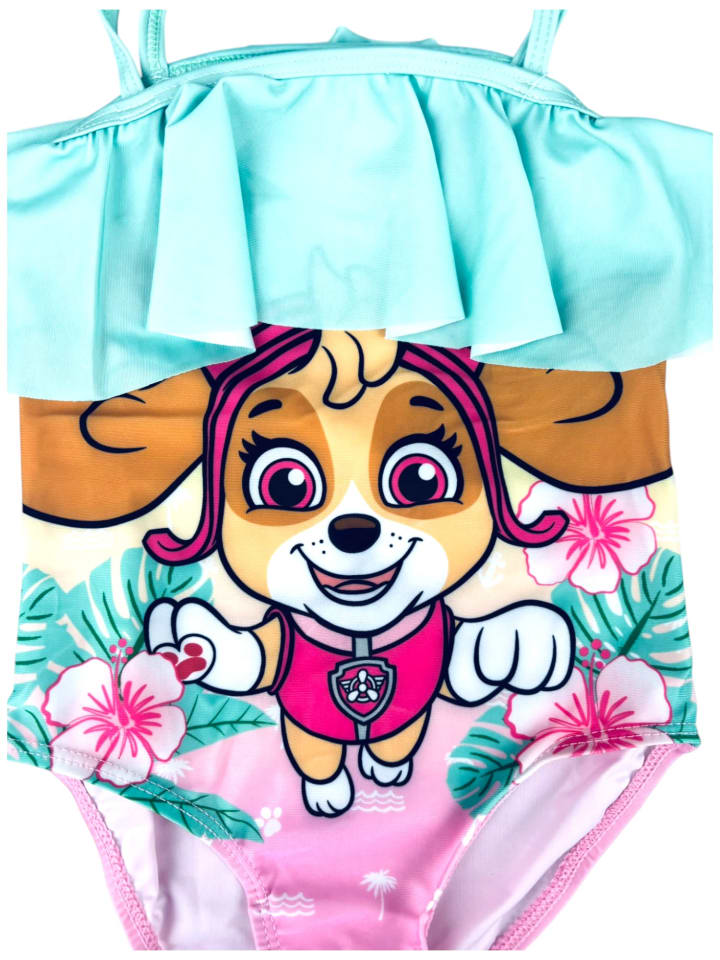 Красочный дизайн с тропическим цветочным принтом и жизнерадостным изображением Скай в центре излучает чистое праздничное настроение. Верх из бирюзового воланчика создает игривый образ и придает купальнику воздушное очарование.
