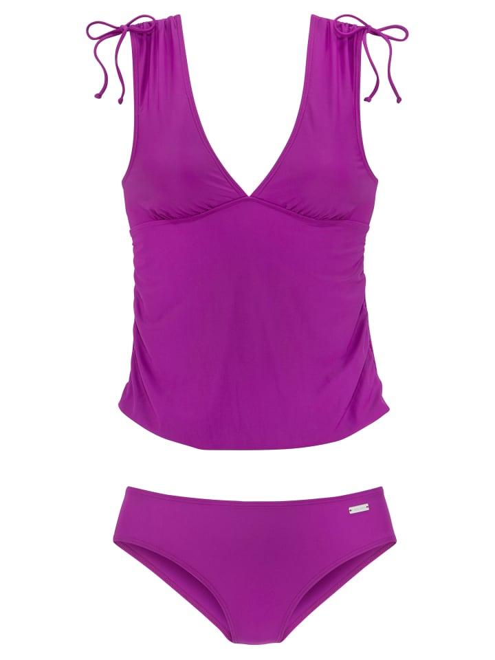 Однотонный танкини от Lascana с широкими бретелями, которые можно собрать сверху. Съемные мягкие чашки. Брюки слегка завышенного кроя. Удобное качество с переработанным полиамидом.