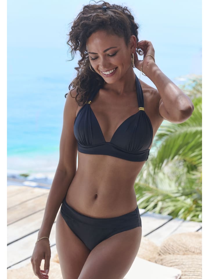 Элегантное бикини с треугольными чашечками от Lascana. С модными аксессуарами. Топ с американской проймой, сборками и широкой резинкой под грудью. Уплотненные чашки со съемными подушечками для чашек A и B. Плавки бикини с отложным поясом. Удобное качество с содержанием переработанного полиамида.