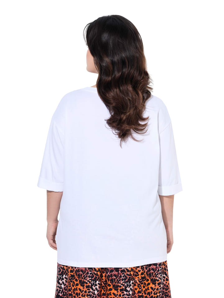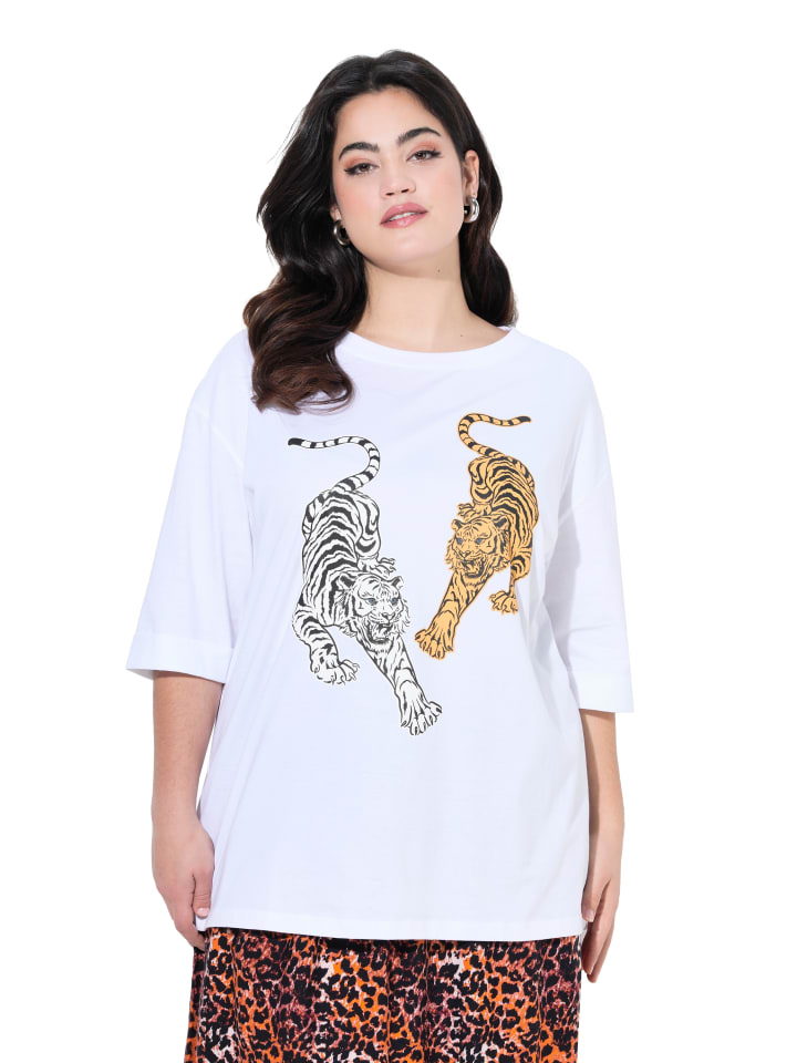 Футболка свободного кроя из мягкого трикотажа с тиграми. Круглый вырез, спущенная линия плеча, рукава 3/4.