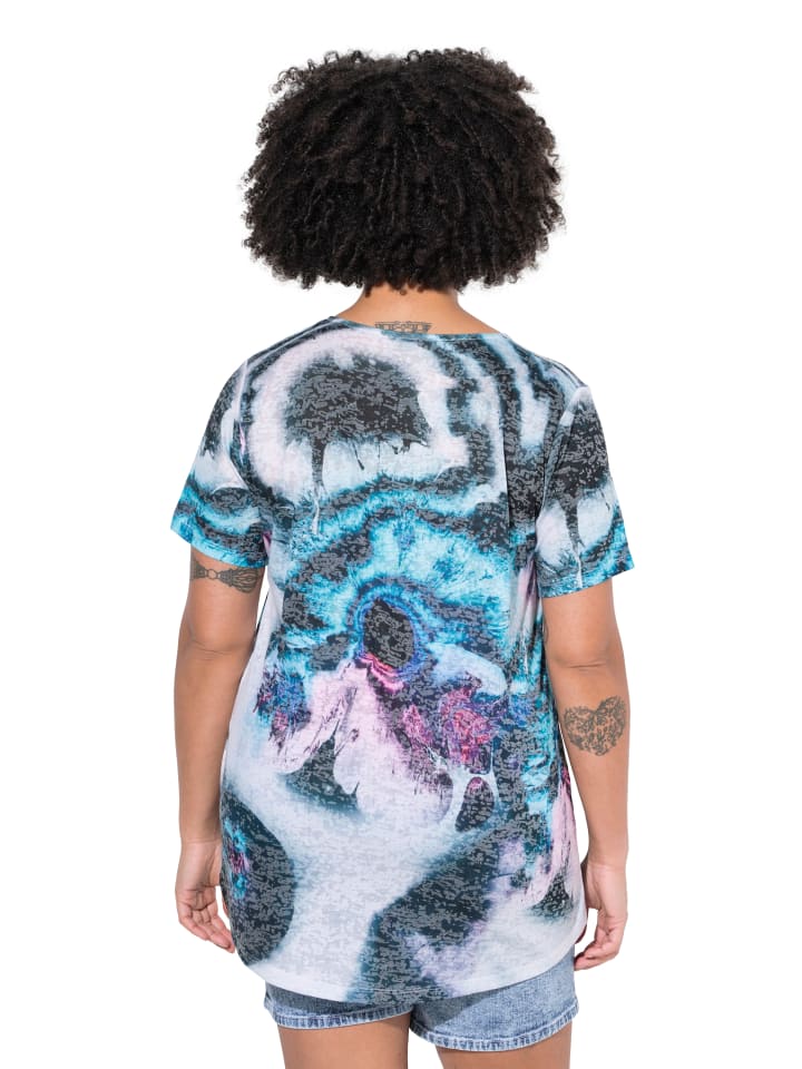 Футболка А-силуэта из выжженного трикотажа с красочным рисунком. V-образный вырез, короткие рукава. Подол сзади удлинен.