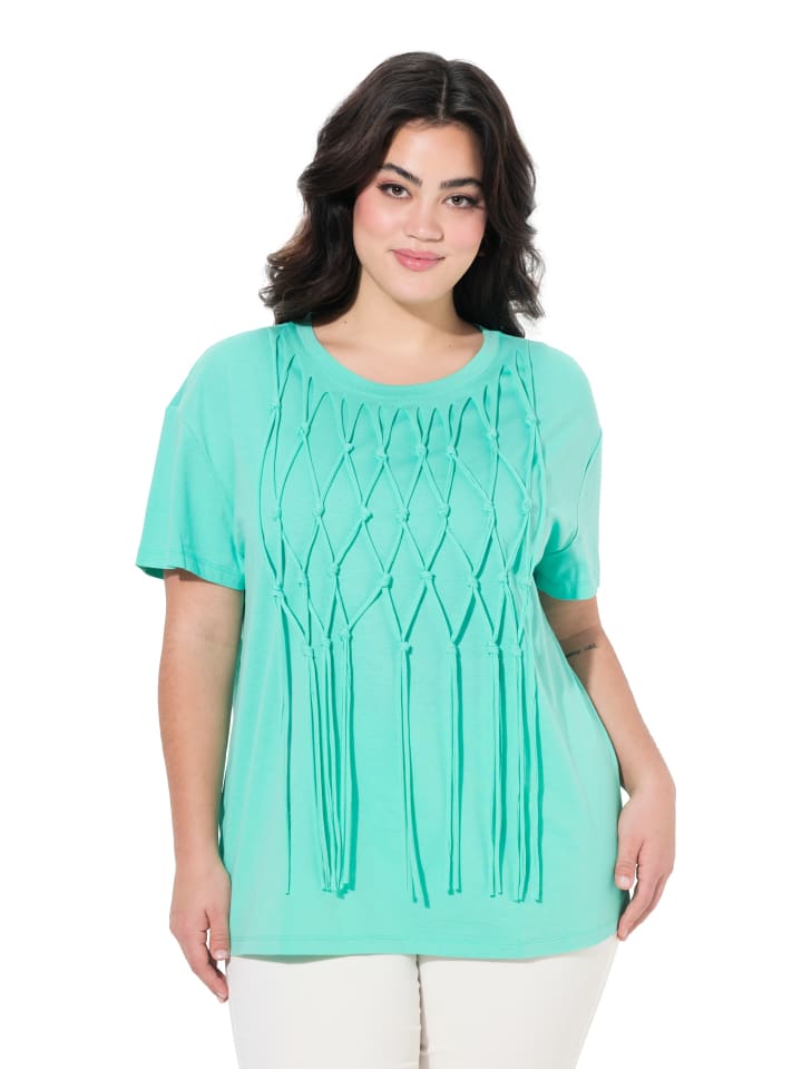 Футболка свободного кроя из мягкого трикотажа с модной завязанной бахромой спереди. Круглый вырез, спущенная линия плеча, короткие рукава.