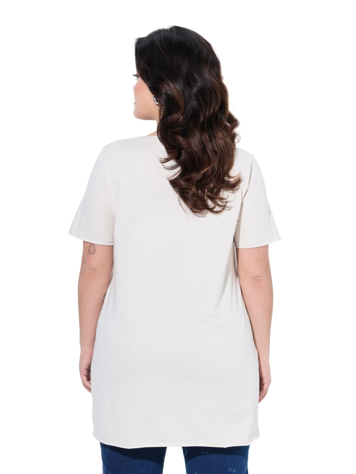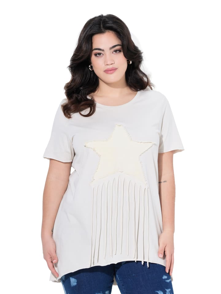 Футболка А-силуэта из мягкого трикотажа со звездой и бахромой. Отделка с открытыми краями. Круглый вырез, короткие рукава, удлиненный подол сзади.