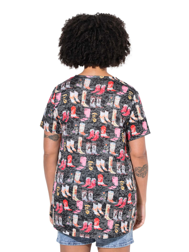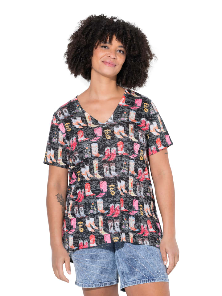 Футболка А-силуэта из выжженного трикотажа с рисунком в виде ковбойских сапог. V-образный вырез, короткие рукава. Подол сзади удлинен.